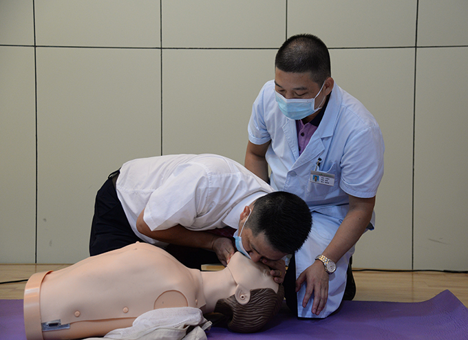 現場(chǎng)還讓員工代表上臺實(shí)操,有關(guān)急救的流程和標準手法,并加以指導修正。