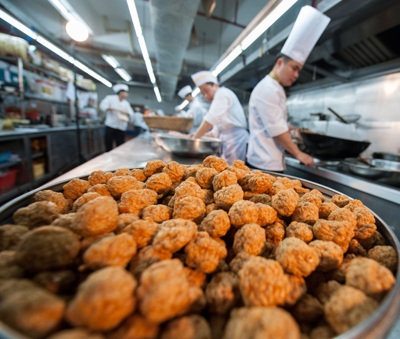 新鮮的豬肉是制作黃金酥丸最關(guān)鍵的材料。以豬后臀部上的瘦肉為上選,在當天凌晨屠宰生豬,即選即做,這樣才能保留豬肉的鮮味和彈性,做出來(lái)的酥丸才爽口味美。"時(shí)間耽誤不得,要不然就沒(méi)法做了。